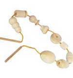 Для удобства нанизывания с каждой стороны ленточки есть деревянная игла, которая легко проходит сквозь гладкие фигурки.