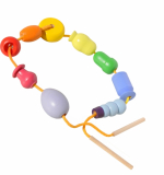 К игре шнуровке в комплект входит шнурок, на обоих концах которого есть крупные деревянные иголочки, на которые и нанизываются бусы-фигурки самых разных цветов.