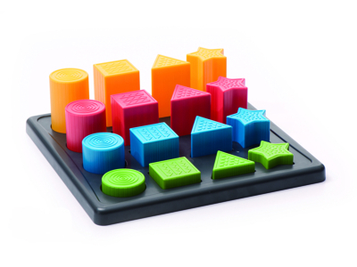 В комплекте основа размерами 30х30 см с 4-мя рядами углублений 4-х форм и 16 объемных вкладышей тех же форм, основных цветов.