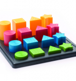 В комплекте основа размерами 30х30 см с 4-мя рядами углублений 4-х форм и 16 объемных вкладышей тех же форм, основных цветов.