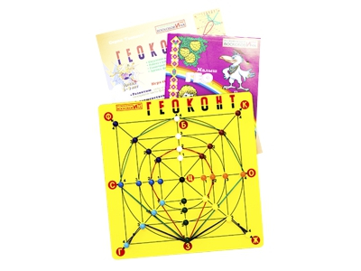 В 33 точках сетки установлены пластмассовые гвоздики (цвета радуги, черный и белый); резинка трех цветов; альбом схем; методическая сказка"Малыш Гео, Ворон Метр и Я, дядя Слава".