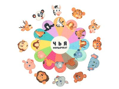 В комплект входит игровая разноцветная основа и 12 элементов с изображением мордочек животных – зебры, леопарда, жирафа, тигра, слона, медведя, носорога, льва, бегемота, обезьянки, оленя и панды.