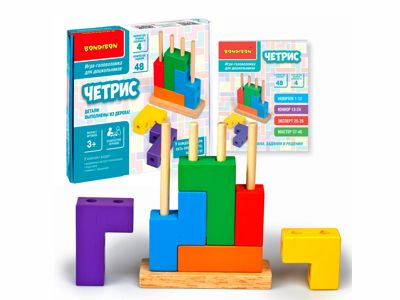 етрис офлайн!! Это возможно вместе с деревянной головоломкой «ЧЕТРИС» от Bondibon! Такие знакомые геометрические фигуры из любимой игры двигаются, изменяются одновременно в четырех плоскостях, и помогают малышу развивать мелкую моторику, пространственное мышление, концентрацию внимания, логику и зрительное восприятие. Правила игры простые, а уровни сложности - разные. Выберите задание в зависимости от возраста игрока. Повторите комбинацию из фигур из задания, насаживая детали на деревянные колышки. Учитывайте форму и цвета деталей. Помогите ребенку понять правила игры, объясните, начиная с легких уровней. Затем будете приятно удивлены, когда малыш сам будет доставать игрушку и пробовать более сложные конструкции. Все детали выполнены из каучукового дерева! В комплект входят: деревянные детали, подставка, книжка с заданиями. 1 игрок - 48 заданий - 4 уровня сложности – 3+ Подарите ребенку «ЧЕТРИС» серии БондиЛогика и он будет искренне Вас радовать своими успехами!