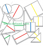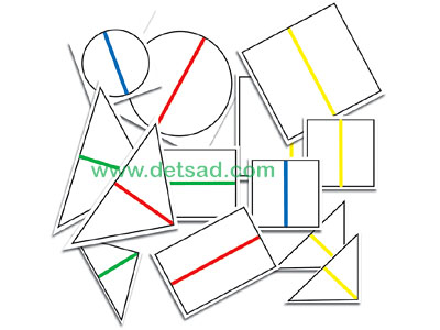 В комплект игры входят: лист-основа 2-х разрезных листов форматом А4 на котором изображены геометрические фигуры (круг, квадрат, прямоугольлник, треугольник) разных по размеру и цвету.
