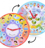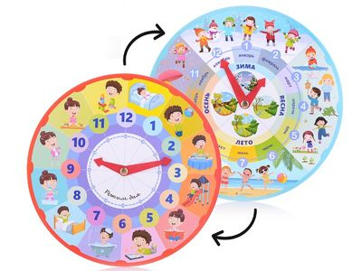 Поворачивайте стрелочки, устанавливайте их в разных сегментах циферблата – и развивайте представления ребенка о правильном распорядке дня и сезонном досуге.