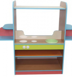 Описание: Основной цвет бук или кремовый. Фасады цветные по желанию заказчика, полочки, перегородки цветные. Стеллаж с двумя полками внизу: со стороны "клиентов" они закрыты. Стеллаж по столешнице разделен на две части, со стороны "продавца" - стилизованные конфорки, выключатели и мойка. В верхней части стеллажа - полка. По обеим краям стоек - две полочки на консолях, верхняя полочка меньше размера.