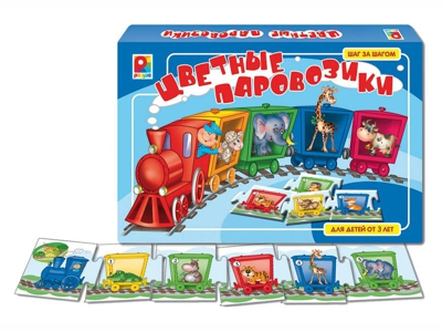 В составе игры 24 карточки-пазла, на которых изображены разноцветные паровозики и цветные вагончики, в которых едут домашние животные, лесные жители, животные жарких стран и морские обитатели.