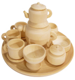 На деревянном подносе представлено всё, что нужно для кукольного чаепития: