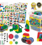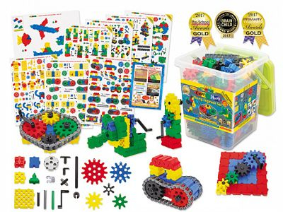 Конструктор содержит 320 деталей – представляет собой набор для ознакомления детей с шестеренчатой и цепной передачами.