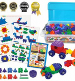 Конструктор состоит из 185 пластмассовых деталей: квадраты, треугольники, колеса, соединительные и направляющие элементы.