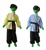 В комплект входят брюки, кушак и картуз из габардина и рубаха из ткани дюспо с отделкой орнаментом.