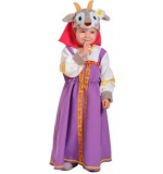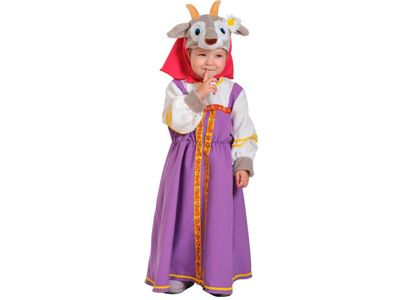 В комплекте шапочка с мордочкой козочки, яркий сарафанчик с отделкой в традиционном народном стиле с белыми рукавами и желтая косынка.