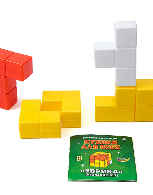 Из набора фигур можно сложить огромное количество красивых построек, а самая главная задача игры: сложить куб 3х3х3 разными способами. Последовательность предлагаемых задач в инструкции условна. Вариант игры Эврика, как и все логические кубики развивают пространственное мышление, воображение, память (особенно зрительную), творческие способности, смекалку и сообразительность.