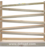 В нашем кугельбане 6 уровней желобов и 5 цветных стеклянных шариков. Прекрасная игрушка, позволяющая малышам переживать движения шара с постоянно меняющемся направлением. На детей действует завораживающее. Но в игрушке есть еще один секрет. Длина желобов рассчитана так, что малыш следит за шариком, не поворачивая головы, двигаются только зрачки глаз. Мышцы глаз получают хорошую гимнастику. Это очень важно для городских детей, чьи глаза малоподвижны.