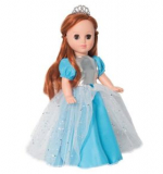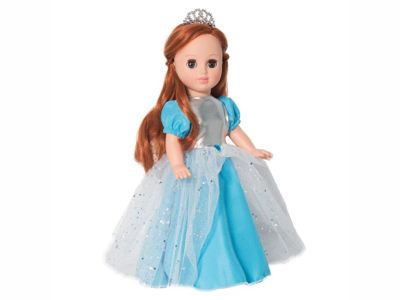 • В комплект одежды входит: нарядное платье из креп-сатина, трикотажной парчи и сетки. Данное платье с короткими рукавами-фонариками. Голову куклы украшает диадема, на ногах туфельки.