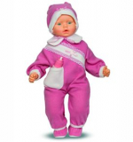 В комплект одежды куклы входит: комбинезон, шапочка из флиса. Комплект дополняют пинетки и пластмассовая бутылочка с соской.