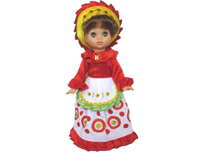 В комплект национальной одежды куклы входит платье, фартук, кокошник с вышивкой, стилизованной под узоры дымковской игрушки. Комплект дополняют туфли.