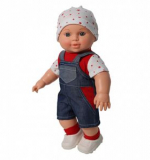 Кукла одета - Джинсовый комбинезон малыша (застегивается на спинке на липучку) дополнен яркой футболкой и шапочкой в тон, а также белыми кроссовками и красными носочками.