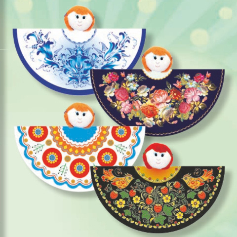 В набор входят платковые куклы с изображениями народных художественных промыслов: гжель, дымковская роспись, жестовская роспись, хохломская роспись.