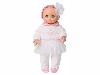 Наряд игрушки представлен белым комбинезоном с ажурными оборками, розовыми манжетами и аппликацией в виде бабочки, а дополняют его мягкая шапочка с бантиком и рюшами