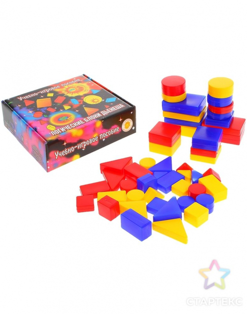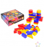 Набор логических блоков состоит из 48 объемных геометрических фигур, различающихся по цвету, форме, размеру и толщине.