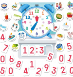 Тематика: Игра помогает детям освоить основы понятия времени: научиться определять часы и минуты, понимать разницу между утром, днём и вечером, а также связывать время с повседневными действиями (проснуться, позавтракать, пойти в школу, поиграть, лечь спать). Магниты выполнены в виде циферблата с большими стрелками, цифр, минутных меток и иконок с действиями.