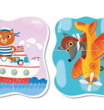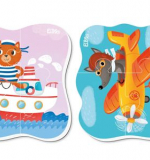 Тематика: На пазлах изображены яркие и забавные транспортные средства: кот в морской форме на красно-белом корабле и волк-пилот на оранжевом самолёте. Иллюстрации выполнены в стилизованном, понятном для малышей виде, с чёткими контурами и насыщенными цветами.