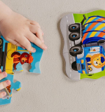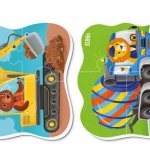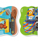 Тематика: На пазлах изображены яркие и забавные строительные машины: желтый экскаватор с медвежонком за рулём и синяя бетономешалка с львёнком. Иллюстрации выполнены в стилизованном, понятном для малышей виде, с чёткими контурами и насыщенными цветами.