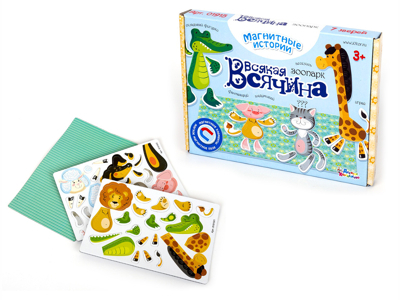 Игра «Всякая всячина, Зоопарк» 7 зверей, серии магнитные истории рекомендуется детям от 3 до 5 лет и состоит из 2-х стороннего мягкого магнитного поля (размером 235 на 150 мм) и 49 мягких магнитных элементов.