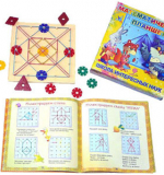Игровое поле - пластиковый планшет с выступающими колышками, расположенными с одинаковыми промежутками по горизонтали и вертикали, за которые можно цеплять входящие в набор резинки и "рисовать фигуры". Сетка колышков с промежутками с одной стороны игрового поля 5х5. С обратной стороны колышки расположены по окружности. Размер 15х15 см.