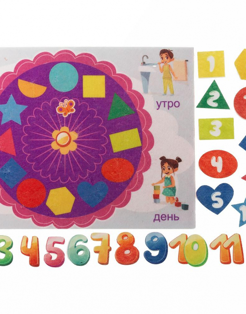 Цель данной игры – научить ребёнка понимать время и определять его по часам, познакомить его с понятиями «минута», «час», «полчаса» и т.д. Фетровый набор поможет развить наблюдательность, логику, внимание, мелкую моторику рук, мышление и зрительное восприятие.