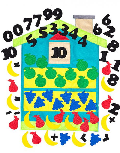 В комплект входит игровое поле (основа) с кармашками для цифр и фигурок, а также игровые элементы в виде цифр от 0 до 10 (22 шт.), яблочек (10 шт.), винограда (10 шт.), груш (10 шт.), бананов (10 шт.), знаков «плюс», «минус», «равно», «больше» и «меньше» (8 шт.).