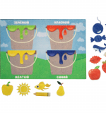 В комплект входит игровая основа с изображением четырёх ведёрок с краской, а также элементы на липучках: карандаши, конфетки, рыбка, кит, яблоко, клубника, жук, горох, божья коровка, солнышко, шарик и др. Сзади имеется специальный карман для хранения фигурок, чтобы они не терялись.