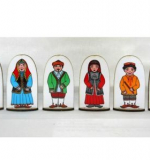 Набор кукол на подставке выполнен из фанеры с изображенными членами башкирской семьи в национальных костюмах: дедушка, бабушка, папа, мама, мальчик, девочка.