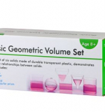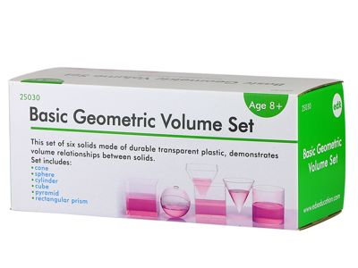 Набор включает в себя 6 прозрачных пластиковых емкостей в форме конуса, сферы, цилиндра, куба, пирамиды, и прямоугольного параллелепипеда.