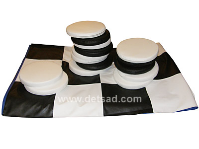 В комплекте: поле - 1 шт., шашки - 24 шт. Размеры: поле - 240*240 см., шашки — диаметр 30*4 см.