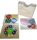 Набор "Шестеренки" - это развивающее пособие, сочетающее в себе деревянные съемные динамичные шестеренки разной формы, цвета и размера для освоения механизма зубчатой передачи с внешним зацеплением и рамки-вкладыши для соотнесения формы, цвета и размера деталей с углублениями для них, размещенных на самих шестеренках. Эти углубления круглой, квадратной, треугольной, шестиугольной формы и в форме пятиугольной звезды. Кроме того, размещенные в углублениях детали, могут передвигаться вместе с шестеренками при их движении по часовой стрелке и против.