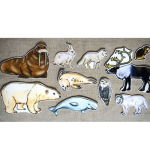 В набор входят: белый медведь, морж, тюлень, песец, полярный волк, полярная сова, лемминг, полярный заяц, олень, белуха.