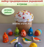 В набор входит: туесок (высота - 12 см, диаметр - 12 см) с вязаной крышечкой, 11 украшений (размер - до 5 см) с колечками для подвешивания, ленточки для крепления к веточкам. Веточки в комплект не входят!
