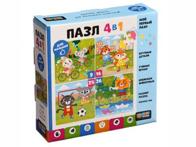 Комплектация: В наборе 4 пазловые картинки, каждая из которых состоит из разного количества крупных элементов: 9, 16, 25 и 36 штук. Общее количество деталей — 86 штук.