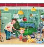 Тематика: На иллюстрации изображён интерьер гаража: папа и сын ремонтируют зелёную машину, рядом — велосипед, инструменты, лестница, птичка и другие детали. Каждый персонаж занимается своим делом, что создаёт динамичную и радостную атмосферу. Цвета и формы выполнены в мультипликационном стиле, понятном и привлекательном для малышей.
