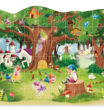 Тематика: На иллюстрации изображён волшебный лес: здесь живут феи, эльфы, единороги, гномы, бабочки и другие сказочные существа. В центре — огромное дерево с домиками на ветках, а рядом — замок, мельница и цветущие поля. Каждый уголок картины наполнен магией, приключениями и добротными персонажами, что делает игру интересной и многогранной. Цвета и формы выполнены в стилизованном, понятном для детей виде.