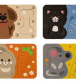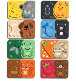 - 8 пазлов из древесного материала из 3 элементов каждый.