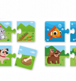 Особенности формы: Элементы имеют удобные замочки, позволяющие соединять только соответствующие пары (животное и его лакомство), что способствует логическому мышлению.