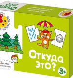 В игровой форме малыши научатся понимать логическую связь на основе двух половинок пазлов связанных по смыслу - что откуда. Например: гриб из леса, пирожок из печи, монеты из кошелька и тому подобное.