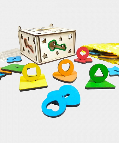 - Геометрические фигуры - 26 шт., ключики - 28 шт., мешок - 1шт., инструкция – 1 шт.