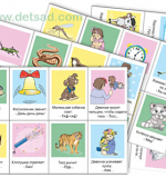 2. Игра «Кто/что так звучит?»: перед ребёнком раскладывается несколько известных ему карточек. Взрослый спрашивает: «Кто так звучит?» или «Что так звучит?» (в зависимости от содержания карточки) и даёт образец звукоподражания, и побуждает ребёнка сказать, кто или что так звучит, и найти карточку с соответствующим изображением. Если ребёнок ещё мал или растерялся и не может сказать, кто или что так звучит, похвалите его за то, что он нашёл нужную карточку, и выразительно прочитайте предложение на ней.