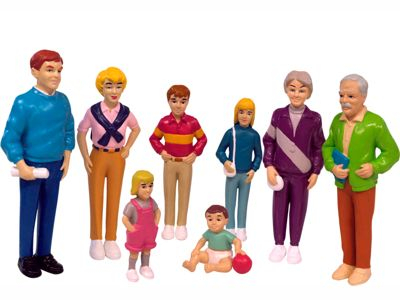 Рассмотрите с детьми все фигурки, предложите найти маму, папу, бабушку, дедушку и т.д. Поговорите с детьми о том, что такое семья. Беседуя о фигурках, можно многое узнать и о том, как дети воспринимают собственные семьи. Особую ценность представляют фигурки детей разных возрастов. Здесь можно затронуть и тему детской ревности, и отношения с маленькими братьями и сестрами, и со старшим братом или сестрой. Фигурки позволяют отобразить в игре и студента, и школьника, и ребенка, посещающего детский сад. Некоторые члены семьи одеты в спортивные костюмы, что настраивает детей на здоровый образ жизни. Предметы в руках у детей и взрослых помогают отобразить деятельность, которой может заниматься данный член семьи - маленький ребенок играет в мяч, дедушка говорит по сотовому телефону или держит книгу и т.п. Можно развить данную тему в беседе с детьми, и поговорить о том, чем обычно занимаются дома их мамы, папы, бабушки, дедушки, братья или они сами.