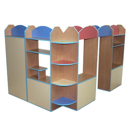 Описание: Основной цвет бук или кремовый. Фасады цветные по желанию заказчика. Ширма угловая на колесиках. Длинный угол состоит из трех секций: первая - для кукольного театра, в верхней части - полка, под полкой - штанга для шторки, внизу тумба для реквизита. Средняя секция со штангой для занавеса. Третья секция: внизу с закрытой со стороны фасада тумбой для реквизита, угловая консоль с 4-мя полками. Короткий угол состоит из двух секций: первая - в виде магазинчика, с открытыми полками для реквизита, прилавком, в верхней части - дополнительная полка, вторая секция полностью закрыта с фасада, внутри - штанга для нарядов и зеркало. Сверху на всех секциях - фигурная крыша. Фасады и крыши цветные.