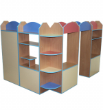 Описание: Основной цвет бук или кремовый. Фасады цветные по желанию заказчика. Ширма угловая на колесиках. Длинный угол состоит из трех секций: первая - для кукольного театра, в верхней части - полка, под полкой - штанга для шторки, внизу тумба для реквизита. Средняя секция со штангой для занавеса. Третья секция: внизу с закрытой со стороны фасада тумбой для реквизита, угловая консоль с 4-мя полками. Короткий угол состоит из двух секций: первая - в виде магазинчика, с открытыми полками для реквизита, прилавком, в верхней части - дополнительная полка, вторая секция полностью закрыта с фасада, внутри - штанга для нарядов и зеркало. Сверху на всех секциях - фигурная крыша. Фасады и крыши цветные.